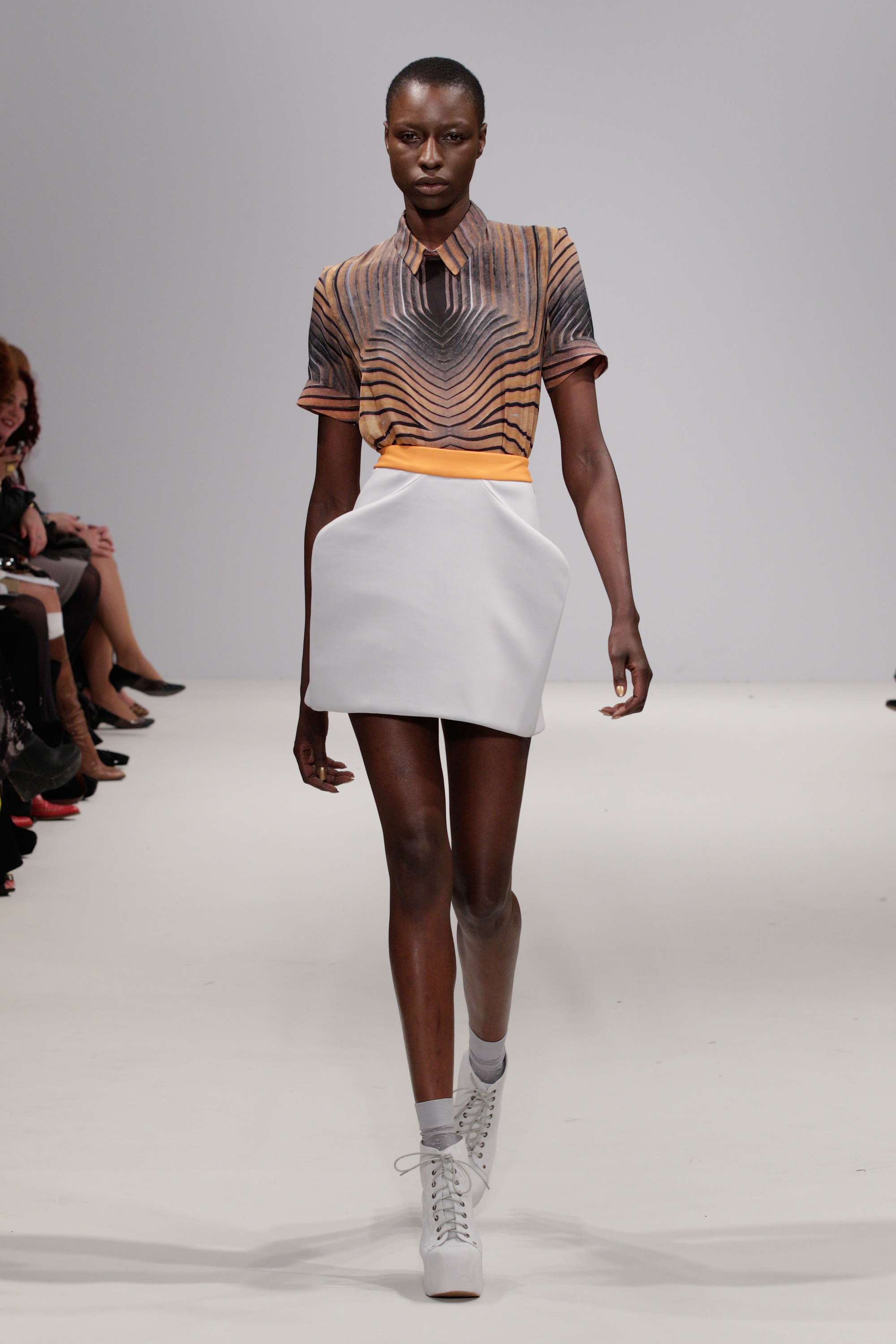 Clearly referring to the cubist movement, the collection features a predominant grey tonal palette broken by cyan and orange shown on ankle-length dresses with over-exaggerated waists or white, squared leather minis combined with sheer orange blouses. Largely influenced by the sculptural vision of raymond Duchamp-Villon, Georgia Hardinge also got inspired by the dark nature of cubo-futurism and created architectural pieces flattering the female body presented on plateau ankle boots with wooden heels. Love, love, love this non-minimalistic minimalsm.